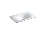 Finish/Color:White, Faucet Hole Spacing:No Holes The new Iron/Tones lavatory asserts one irrefutable truth - Kohler Cast Iron in the bathroom is a gorgeous proposition.Self-rimming or undercounter lavatory basin without overflow. Round-in-square basin shape with integrated flat work surface. Features an ultra-thick layer of enamel that is as strikingly beautiful as it is durable. Can be installed either above or below the countertop. No faucet hole drillings; designed for use with wall-mount or deckmount lavatory faucets. Cut-out template and basin clamp assembly included. Basin area: 23' (60.3 cm) x 14' (36.8 cm). Drain opening: 1' (4.4 cm). Integrated, flat work surface Constructed of KOHLER cast iron Exterior dimensions: 24-3/4 inches long by 15-5/8 inches wide Interior dimensions: 23-3/4 inches long by 14-1/2 inches wide Self-rimming or undercounter installation